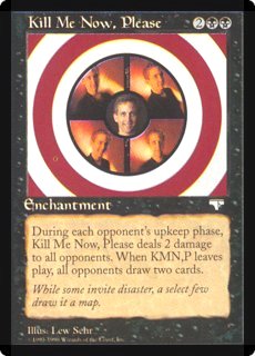 KILL ME NOW, PLEASE 2BB Enchantment During each opponent's upkeep phase, Kill Me Now, Please deals 2 damage to all opponents. When KMN,P leaves play, all opponents draw two cards. While some invite disaster, a select few draw it a map. |