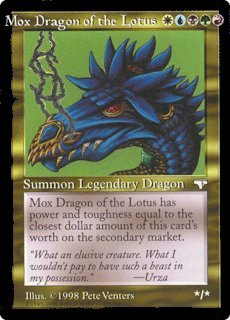 | MOX DRAGON OF THE LOTUS WUBGR Summon Legendary Dragon (*/*) Mox Dragon of the Lotus has power and toughness equal to the closest dollar amount of this card's worth on the secondary market. "What an elusive creature. What I wouldn't pay to have such a beast in my possession." —Urza |