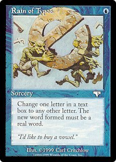 RAIN OF TYPOS U Sorcery Change one letter in a text box to any other letter. The new word formed must be a real word. "I'd like to buy a vowel." |