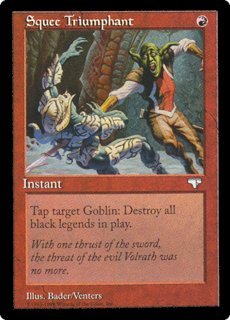 | SQUEE TRIUMPHANT R Instant Tap target Goblin: Destroy all black legends in play. With one thrust of the sword, the threat of evil Volrath was no more. |