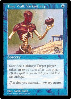 TIME WALK VARIANT #23 U Sorcery Sacrifice a kidney: Target player takes an extra turn after this one. (If the spell is countered, you still lose the kidney.) If at first you succeed... try, try again. |