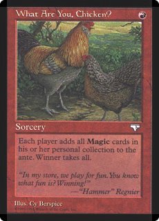 WHAT ARE YOU, CHICKEN? R Sorcery Each player adds all Magic cards in his or her personal collection to the ante. Winner takes all. "In my store, we play for fun. You know what fun is? Winning!" —"Hammer" Regnier |