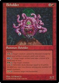 | BEHOLDER 4R Summon Beholder (3/2) Flying BB,T: Target creature cannot be blocked except by black and artifact creatures until end of turn. UU,T: Untap target artifact and take control of it until end of turn. GG,T: Tap target creature. RR,T: Beholder deals damage equal to its power divided any way you choose among any number of target creatures. WW,T: Destroy target enchantment. |