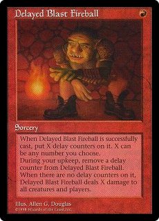| DELAYED BLAST FIREBALL R Sorcery When Delayed Blast Fireball is successfully cast, put X delay counters on it. X can be any number you choose. During your upkeep, remove a delay counter from Delayed Blast Fireball. When there are no delay counters on it, Delayed Blast Fireball deals X damage to all creatures and players. |