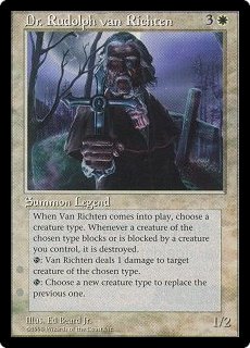 DR. RUDOLPH VAN RICHTEN 3W Summon Legend (1/2) When Van Richten comes into play, choose a creature type. Whenever a creature of the chose type blocks or is blocked by a creature you control, it is destroyed. T: Van Richten deals 1 damage to target creature of the chosen type. T: Choose a new creature type to replace the previous one. |