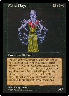 | MIND FLAYER 3BB Summon Illithid (3/3) T: Gain control of target creature with casting cost less than four. While you control target creature, it loses all special abilities. Each Mind Flayer may control a number of target creatures equal to the number of Mind Flayers in play. T: Sacrifice a creature controlled by Mind Flayer to add an amount of colorless mana equal to its casting cost to your mana pool. |