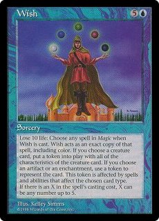 WISH 5U Sorcery Lose 10 life: Choose any spell in Magic when Wish is cast. Wish acts as an exact copy of that spell, including color. If you choose a creature card, put a token into play with all of the characteristics of the creature card. If you choose an artifact or enchantment, use a token to represent the card. This token is unaffected by spells and abilities that affect the chosen card type. If there is an X in the spell's casting cost, X can be any number up to 5. |