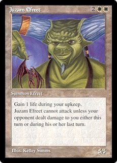 JUZAM EFREET 2WW Summon Efreet (5/5) Gain 1 life during your upkeep. Juzam Efreet cannot attack unless your opponent dealt damage to you either this turn or during his or her last turn. |