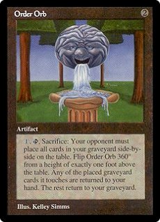 | ORDER ORB 2 Artifact 1,T, Sacrifice: Your opponent must place all cards in your graveyard side-by-side on the table. Flip Order Orb 360° from a height of exactly one foot above the table. Any of the placed graveyard cards it touches are returned to your hand. The rest return to your graveyard. |