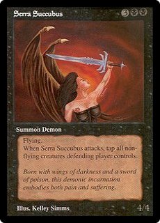 SERRA SUCCUBUS 3BB Summon Demon (4/4) Flying When Serra Succubus attacks, tap all non-flying creatures defending player controls. Born with wings of darkness and a sword of poison, this demonic incarnation embodies both pain and suffering. |