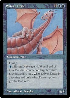 SHIVAN DRAKE 4UU Summon Drake (5/5) Flying U: Shivan Drage gets -1/-0 until end of turn. Put -0/-1 counter on target creature. Use this ability only when Shivan Drake is attacking and only when Drake's power is greater than zero. |