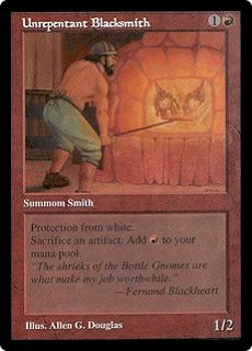 | UNREPENTANT BLACKSMITH 1R Summon Smith (1/2) Protection from white Sacrifice an artifact: Add R to your mana pool. "The shrieks of the Bottle Gnomes are what makes my job worthwhile." —Fernand Blackheart |