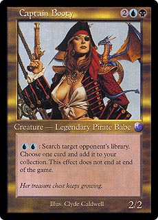 | CAPTAIN BOOTY 2UB Creature — Legendary Pirate Babe (2/2) UU: Search target opponent's library. Choose one card and add it to your collection. This effect does not end at end of the game. Her treasure chest keeps growing. |