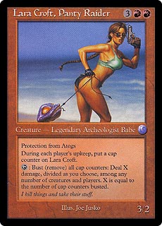 LARA CROFT, PANTY RAIDER 3RR Creature — Legendary Archaeologist Babe (3/2) Protection from Atogs During each player's upkeep, put a cap counter on Lara Croft. T: Bust (remove) all cap counters: Deal X damage, divided as you choose, among any number of creatures and players. X is equal to the number of cap counters busted. I kill things and take their stuff. |