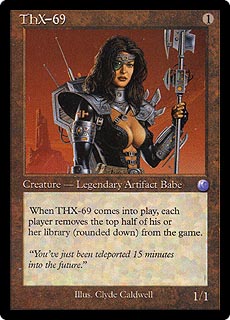 | THX-69 1 Creature — Legendary Artifact Babe (1/1) When THX-69 comes into play, each player removes the top half of his or her library (rounded down) from the game. "You've just been teleported 15 minutes into the future." |