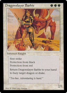 DRAGONSLAYER BARBIE WWW Summon Knight (2/1) First strike Protection from black Protection from red Return Dragonslayer Barbie to your hand to bury target dragon or drake. "Tee-hee. Adventuring is hard." |