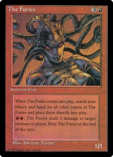 | THE FURIES 3R Summon Fury (1/1) When The Furies comes into play, search your library and hand for all other copies of The Furies and place them directly into play. RR: The Furies deals 1 damage to target creature or player. Bury The Furies at the end of the turn. |