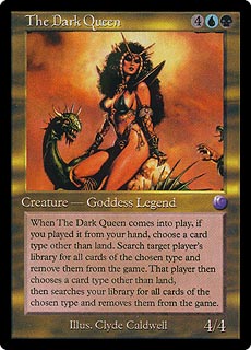 | THE DARK QUEEN 4UB Creature — Goddess Legend (4/4) When The Dark Queen comes into play, if you played it from your hand, choose a card type other than land. Search target player's library for all cards of the chosen type and remove them from the game. That player then chooses a card type other than land, then searches your library for all cards of the chosen type and removes them from the game. |