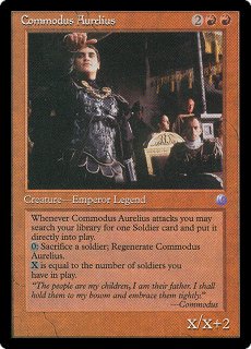 | COMMODUS AURELIUS 2RR Creature — Emperor Legend (X/X+2) Whenever Commodus Aurelius attacks you may search your library for one Soldier card and put it directly into play. 0, Sacrifice a soldier: Regenerate Commodus Aurelius. X is equal to the number of soldiers you have in play. "The people are my children, I am their father. I shall hold them to my bosom and embrace them tightly." —Commodus |