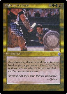 FIGHT TO THE DEATH 1GBR Enchantment Any player may discard a card from his or her hand to give target creature +X/+0 or +0/+X until end of turn, where X is the discarded card's converted mana cost. "People should know when they are conquered." —Quintus |