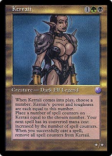 KERRAII 1GB Creature — Dark Elf Legend (*/*) When Kerraii comes into play, choose a number. Kerraii's power and toughness are each equal to this number. Place a number of spell counters on Kerraii equal to the chosen number. Your next spell has its converted mana cost increased by the number of spell counters. When you successfully cast a spell, remove the spell counters from Kerraii. |