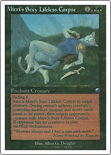MIRRI'S SEXY LIFELESS CORPSE 1GG Enchant Creature Fading 8 Attach Mirri's Sexy Lifeless Corpse to target creature. During owner's upkeep, creature's controller sacrifices creature and draws cards equal to its power, then targets opponent's creature with Mirri's Sexy Lifeless Corpse. If opponent has no creatures in play, sacrifice enchantment. "Momma always said I had a date with death." —Name Withheld by Request |