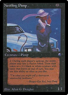 | NETTLING PIMP 2B Creature — Pimp (1/1) 2: During each player's upkeep, the active player may hire a Harlot token. Treat each token as a 2/2 black or white creature with haste that leaves at end of turn. You may use this ability as often as you like. "I'm what you might call a short-term relationship facilitator." —Boogey-Eye Red, Imp Pimp |