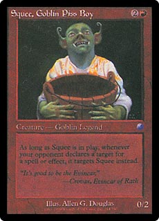 SQUEE, GOBLIN PISS BOY 2R Creature — Goblin Legend (0/2) As long as Squee is in play, whenever your opponent declares a target for a spell or effect, it targets Squee instead. "It's good to be the Evincar." —Crovax, Evincar of Rath |